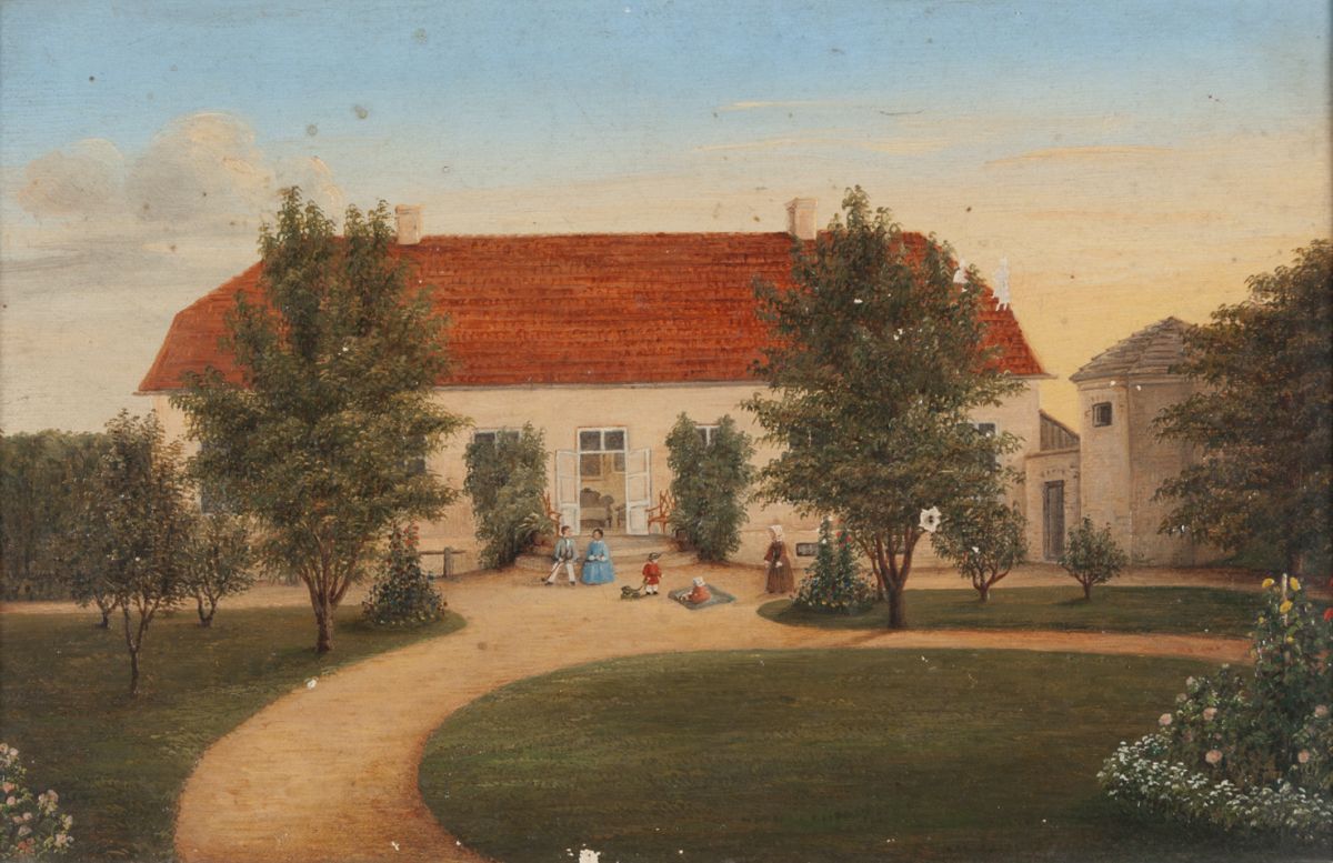 Sophie Julie von Ungern-Sternberg. Vidruka mõisa härrastemaja. 1852. Õli. (Eesti Rahva Muuseum) Maja ees on kunstnik jäädvustanud oma perekonna.