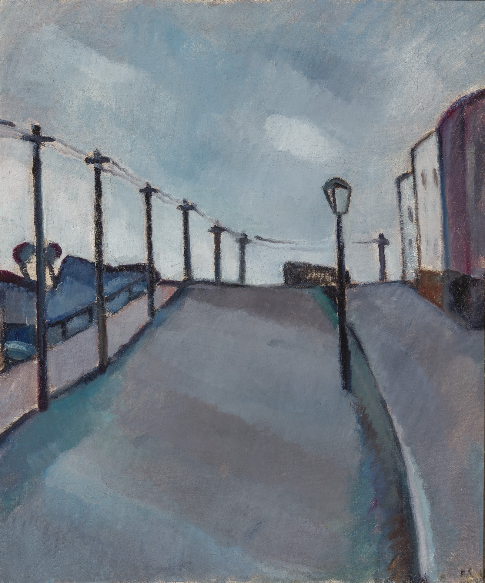Hoopis teistsuguseid meeleolusid kannab Ragnar Ekelundi „Eeslinna tänav (Hall tänav)“. Kunstnikudebüüdi järel Prantsuse impressionismist mõjutatud Septem kunstnikerühma ridadesse kutsutud Ekelund ei pidanud impressionistide pillerkaaritavat värvipaletti endale siiski päriselt omaseks. Teda huvitas pigem ruumi konstrueerimine, erinevate sügavusplaanide (esi-, kesk- ja tagaplaan) ning vertikaalse ja horisontaalse mõõtme ühendamine. Linnaarhitektoonika lihtsustub Ekelundi käsitluses põhiliste geomeetriliste kujunditeni, jõuliselt tõusevad esile horisontaalsust ja vertikaalsust rõhutavad objektid. Kunstniku maastiku- ja linnavaated on enamasti inimtühjad, otsekui mahajäetud. Hüljatuse tunnet võimendab teoste melanhoolne meeleolu, mille Ekelund saavutab isikupärase summutatud valgusekujutuse abil.