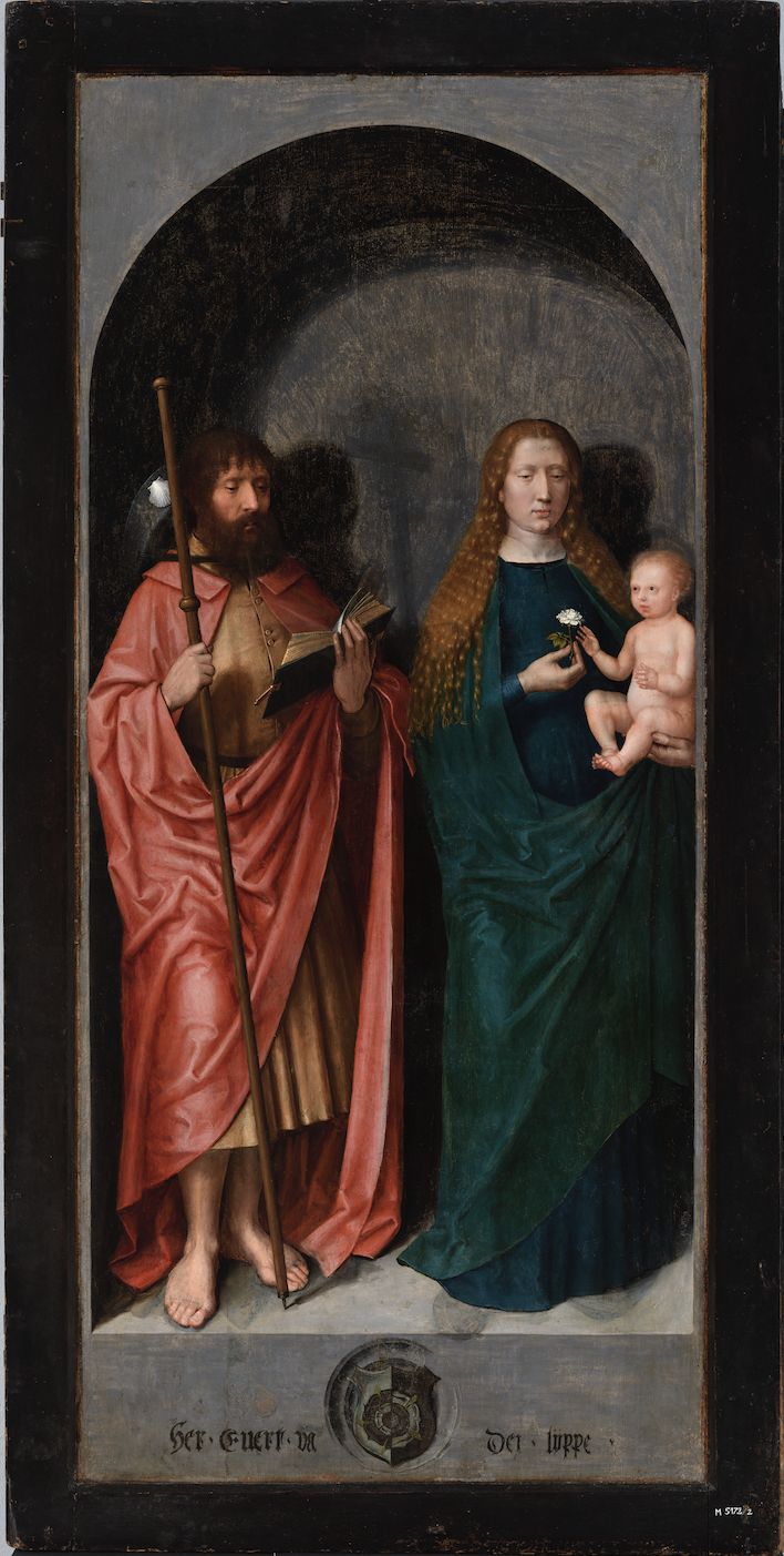 Altariretaabli vasaku tiiva välisküljel seisavad neitsi Maarja Kristuslapsega ja apostel Jaakobus vanem. Tegu on umbes 1520. aastast pärit ülemaalinguga; algselt oli tiibade kujutatud frantsiskaani pühakuid. Maarja ulatab Kristuslapsele valge roosi – neitsilikkuse ja paradiisi sümboli. Välistiibadel kujutatud pühakud on tõenäoliselt maalinud Tallinnas sündinud kunstnik Michel Sittow, kes viibis kodulinnas oma viimastel eluaastatel (1518–1525). 1520. aastate ülemaalingute järel asus see ilmselt ühel Tallinna dominiiklaste kloostri altaril. Luterlikul perioodil, 16. sajandi keskel, tehti altariretaabel ümber epitaafiks ning see paiknes kuni Teise maailmasõjani Niguliste kirikus.