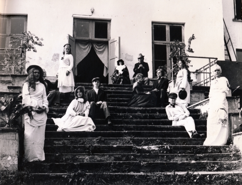 Juulikuu pühapäeva pealelõuna. Praktika lõpp. Hommikupoolikul leidsime rikka talu Palmse külas: seal oli alles kogu saali mööbel ja palju perekonnapilte Pahlenitest. Kuuma pühapäeva pealelõuna sunnib midagi ette võtma. Kehastusime valgete kardinate ja ilusate tütarlaste abil Pahlenite perekonnafotosid kordama. Tollel hetkel oli see halvamaitseline nali, mis nagu kõik lubamatu/sobimatu…, õhinat tekitab ja naerma ajab. Endiste pärisorjade lapsi 400 aastat hiljem…“ (L. Pärtelpoeg. Foto autor: Vello Liiv)