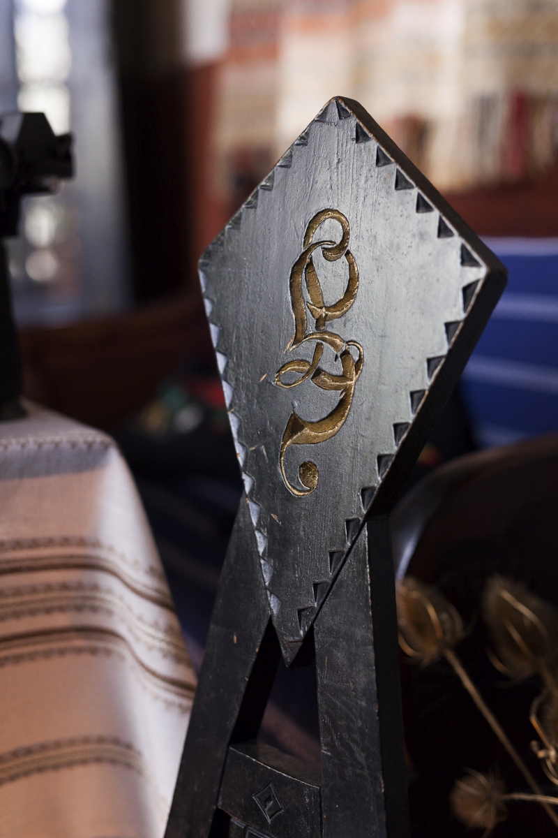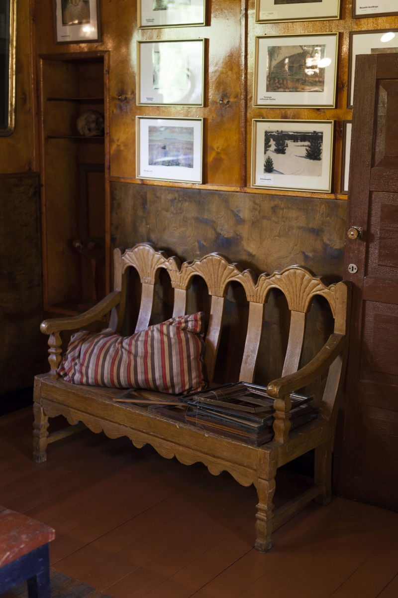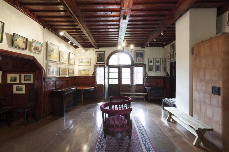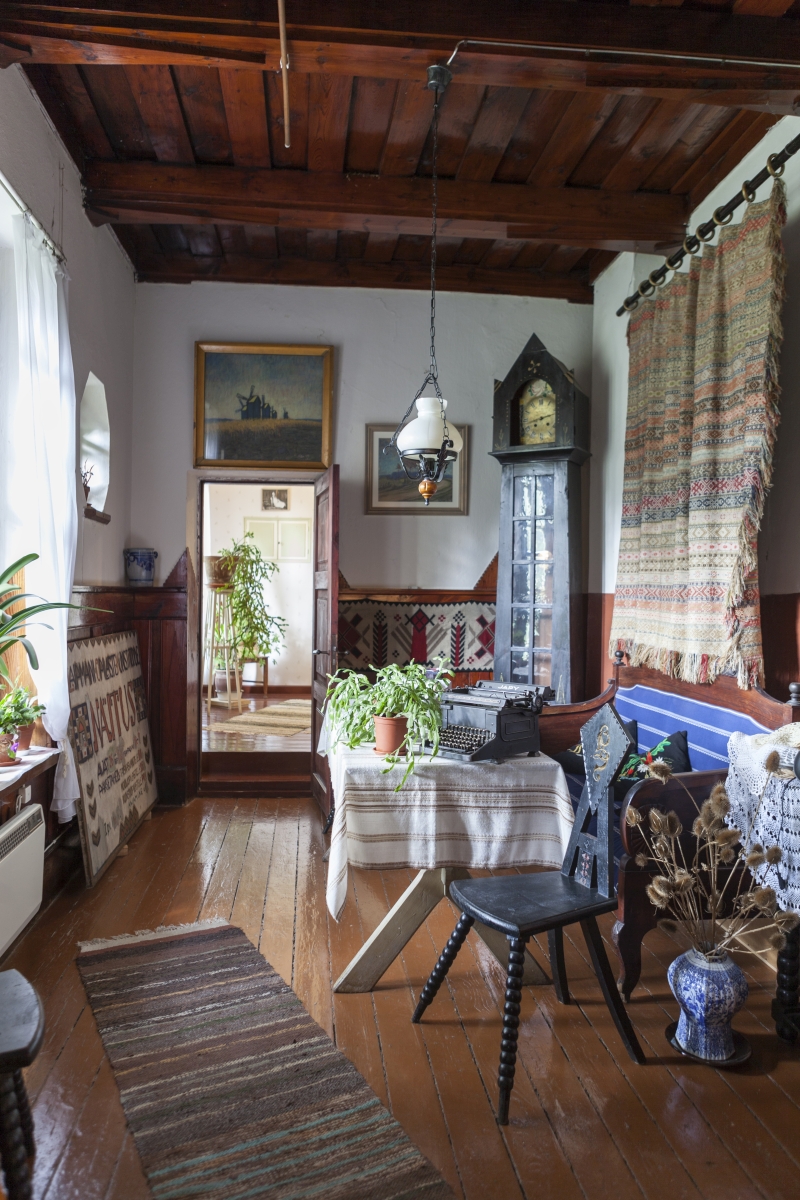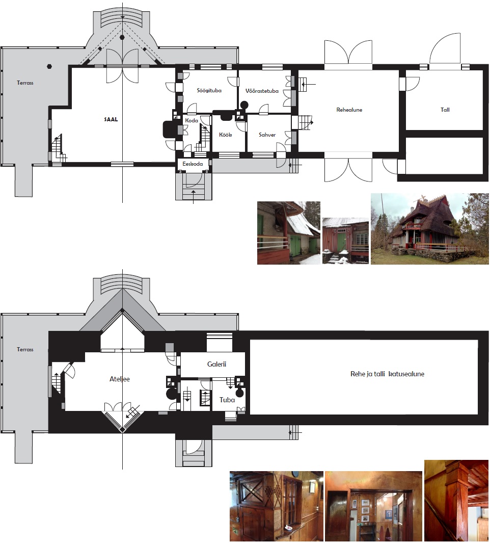 Aga seda rasket ja massiivset katust liigendavad erineva kujuga ärkliaknad on hoopis teisest ooperist – uueaegsed ja moekohased. Aiapoolset sissepääsu kroonib koguni kahekordne valgmik, samas on postidele toetuv rõdu ning ümber hoone nurga kulgev avar terrass. Siseruumid on kitsukesed ja kohati ootamatult sopilised, põrandad vahelduva kõrgusega, ilusa kahepoolse valgustusega on ülemise korruse ateljee. Nii välis- kui ka sisekujunduses on kasutatud rahvapärast puulõikeornamentikat.
